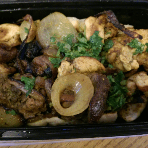 JERUSALEM MIXED GRILLMe’orav Yerushalmi, an offal dish, chicken hearts, spleens, and liver mixed with bits of lamb cooked on a flat grill, seasoned with onion, garlic, pepper, cumin, turmeric, olive, oil, and coriander.